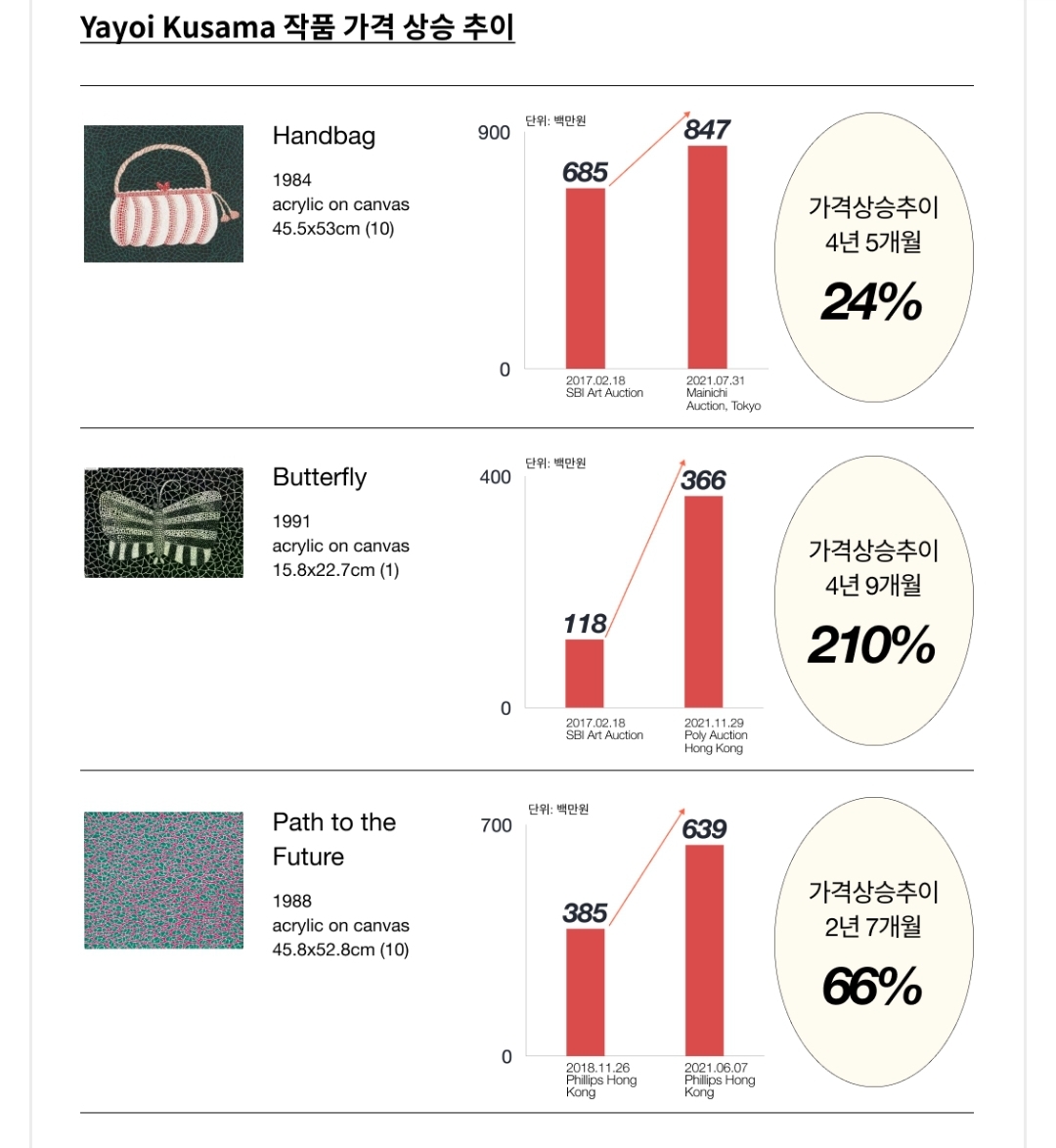 ① 쿠사마 야요이 작품 가격 상승 추이(중간가, 평균 낙찰가), ② 최근 작품 경매 이력(높은 가격 낙찰),