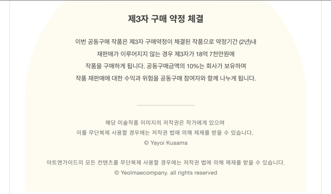 이번 공동구매의 경우 약정 기간(2년) 내에 재판매가 이루어지지 않으면 제 3자가 18억 7천만원에(10%) 구매하게 된다고 하네요.