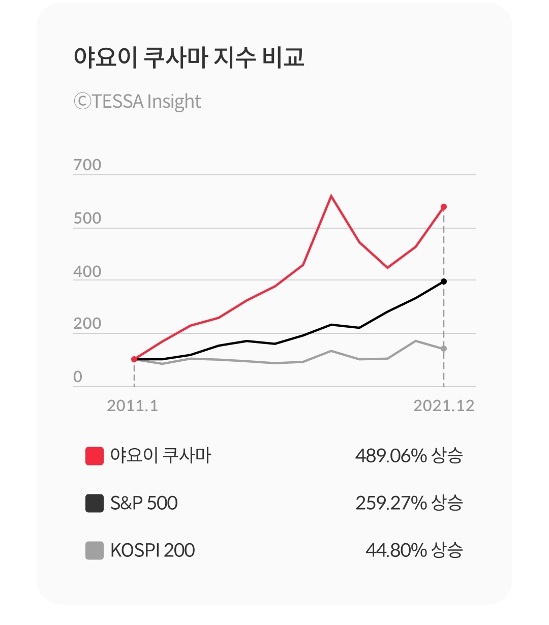 지난 10년간 쿠사마 야요이님의 지수는 489% 상승률을 보여주고 있으며 S&P 500과 비교했을때 이는 2배 수치입니다.