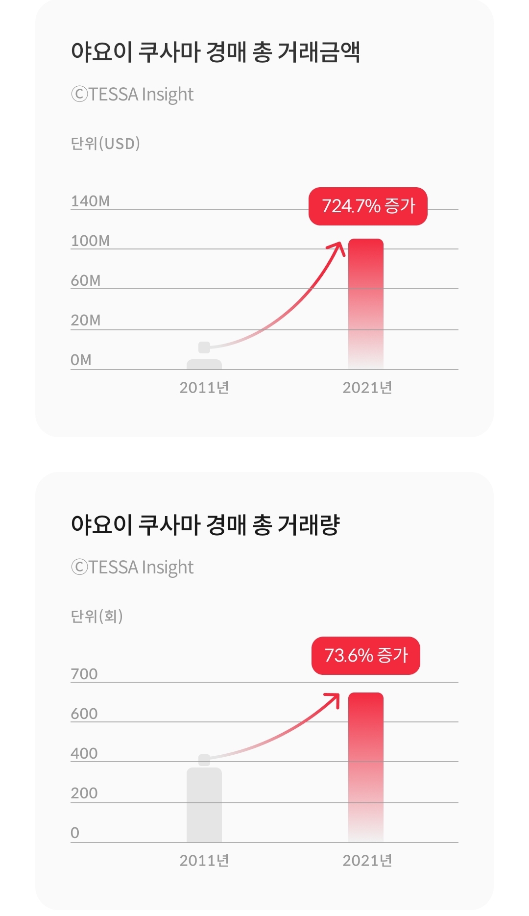 2021년 쿠사마 야요이님의 작품 경매 횟수는 총 665회로, 경매 유찰률은 8% 수준으로 현저히 낮은 것을 알 수 있습니다.